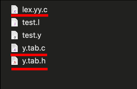 - 读取 Yacc 文件,根据描述文件生成 C 语言实现的语法分析器代码文件 y.tab.h 和 y.tab.c,该文件中实现了语法分析器函数